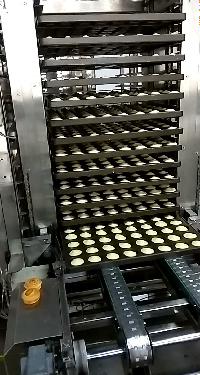 पैन को कन्वेयर द्वारा प्रूफ़र में डाला जाता है और एक दूसरे को स्पर्श नहीं करते हैं।एक बार एक पंक्ति भर जाने के बाद, इसे एल-आकार के वाहक के साथ उठाया जाता है।यह प्रक्रिया तब तक दोहराई जाती है जब तक कि पहला आटा शीर्ष स्तर तक नहीं पहुंच जाता।फिर, पैन को प्रूफिंग रूम से बाहर ले जाया जाता है।