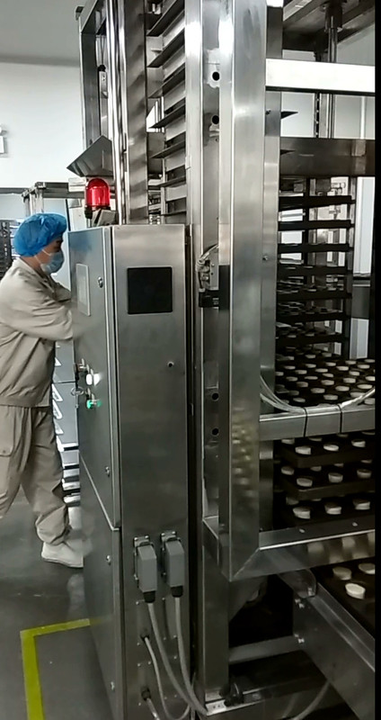 प्रूफिंग के बाद, पैन ट्रॉली से ऑटो ट्रॉली अन-लोडर के माध्यम से नीचे जाता है और ओवन में जाता है।